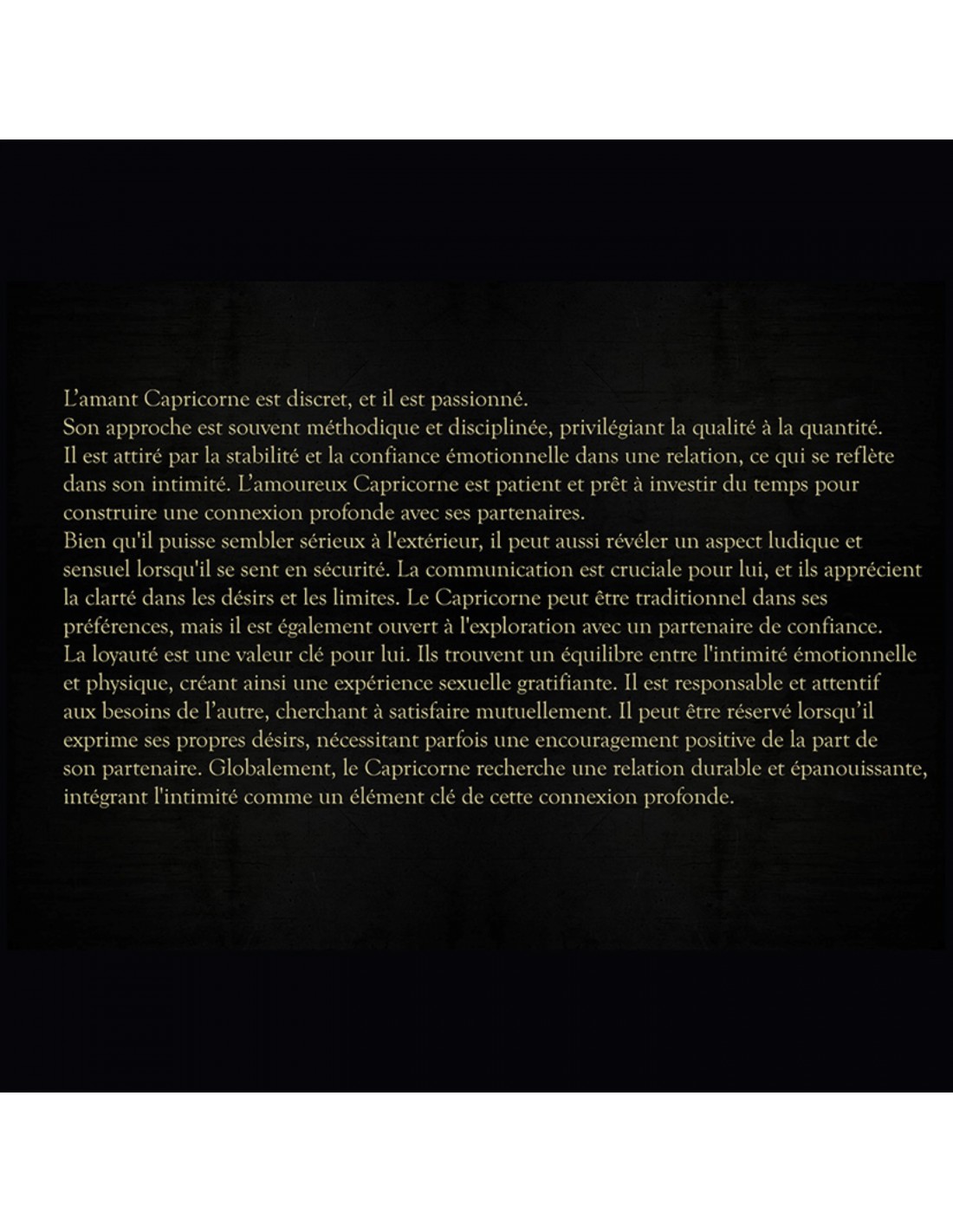 L’amant Capricorne est discret, et il est passionné. Son approche est souvent méthodique et disciplinée, privilégiant la qualité à la quantité. Il est attiré par la stabilité et la confiance émotionnelle dans une relation, ce qui se reflète dans son intimité. L’amoureux Capricorne est patient et prêt à investir du temps pour construire une connexion profonde avec ses partenaires. Bien qu'il puisse sembler sérieux à l'extérieur, il peut aussi révéler un aspect ludique et sensuel lorsqu'il se sent en sécurité. La communication est cruciale pour lui, et ils apprécient la clarté dans les désirs et les limites. Le Capricorne peut être traditionnel dans ses préférences, mais il est également ouvert à l'exploration avec un partenaire de confiance. La loyauté est une valeur clé pour lui. Ils trouvent un équilibre entre l'intimité émotionnelle et physique, créant ainsi une expérience sexuelle gratifiante. Il est responsable et attentif aux besoins de l’autre, cherchant à satisfaire mutuellement. Il peut être réservé lorsqu’il exprime ses propres désirs, nécessitant parfois une encouragement positive de la part de son partenaire. Globalement, le Capricorne recherche une relation durable et épanouissante, intégrant l'intimité comme un élément clé de cette connexion profonde.