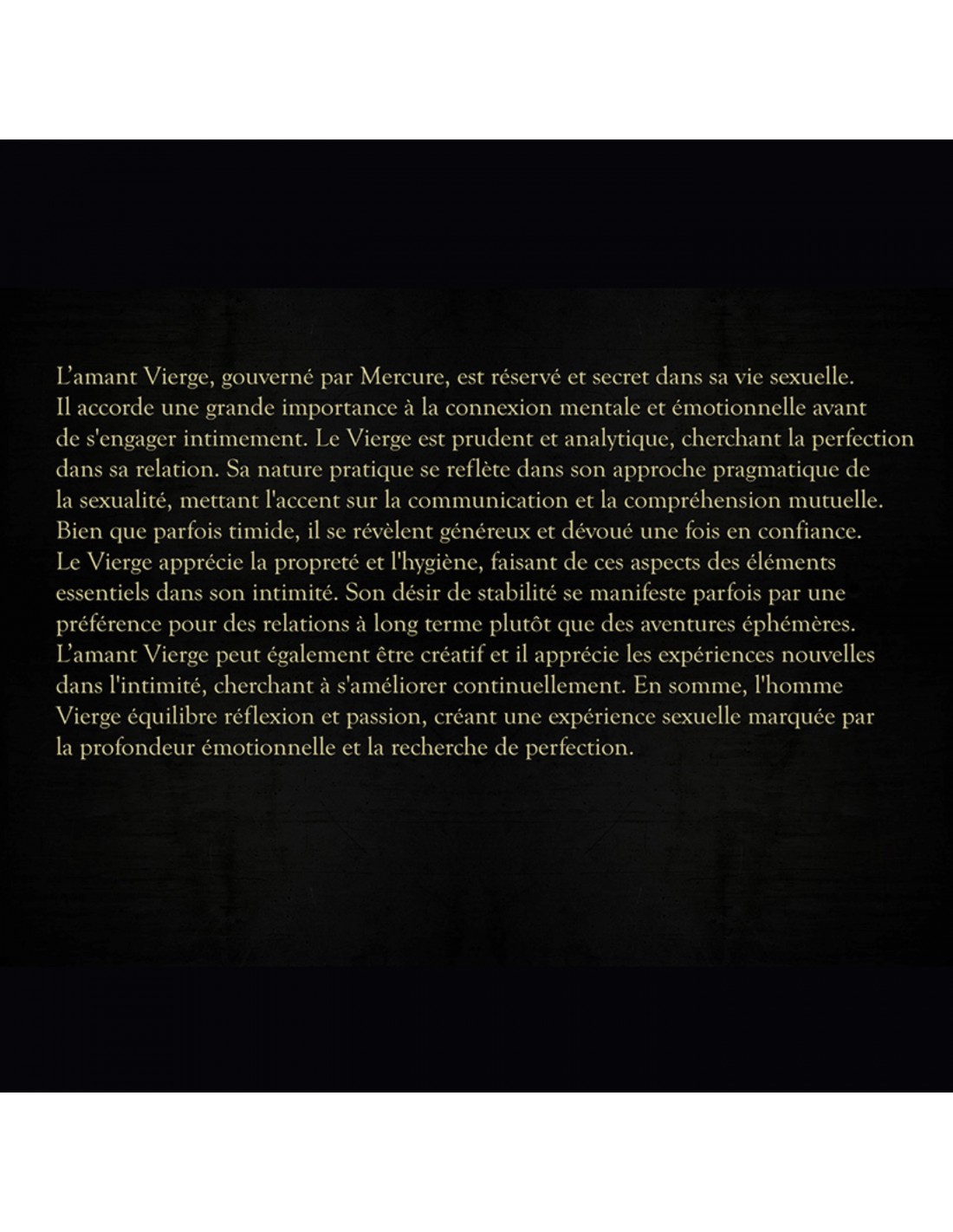 L’amant Vierge, gouverné par Mercure, est réservé et secret dans sa vie sexuelle. Il accorde une grande importance à la connexion mentale et émotionnelle avant de s'engager intimement. Le Vierge est prudent et analytique, cherchant la perfection dans sa relation. Sa nature pratique se reflète dans son approche pragmatique de la sexualité, mettant l'accent sur la communication et la compréhension mutuelle. Bien que parfois timide, il se révèlent généreux et dévoué une fois en confiance. Le Vierge apprécie la propreté et l'hygiène, faisant de ces aspects des éléments essentiels dans son intimité. Son désir de stabilité se manifeste parfois par une préférence pour des relations à long terme plutôt que des aventures éphémères. L’amant Vierge peut également être créatif et il apprécie les expériences nouvelles dans l'intimité, cherchant à s'améliorer continuellement. En somme, l'homme Vierge équilibre réflexion et passion, créant une expérience sexuelle marquée par la profondeur émotionnelle et la recherche de perfection.