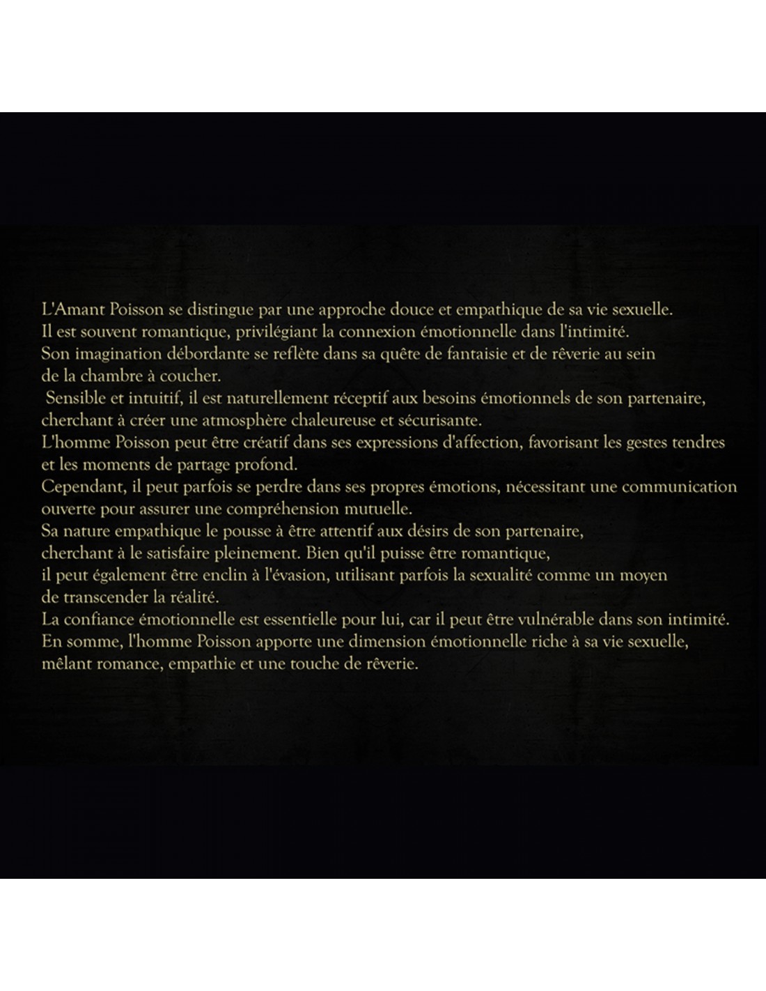 L'Amant Poisson se distingue par une approche douce et empathique de sa vie sexuelle. Il est souvent romantique, privilégiant la connexion émotionnelle dans l'intimité. Son imagination débordante se reflète dans sa quête de fantaisie et de rêverie au sein de la chambre à coucher. Sensible et intuitif, il est naturellement réceptif aux besoins émotionnels de son partenaire, cherchant à créer une atmosphère chaleureuse et sécurisante. L'homme Poisson peut être créatif dans ses expressions d'affection, favorisant les gestes tendres et les moments de partage profond. Cependant, il peut parfois se perdre dans ses propres émotions, nécessitant une communication ouverte pour assurer une compréhension mutuelle. Sa nature empathique le pousse à être attentif aux désirs de son partenaire, cherchant à le satisfaire pleinement. Bien qu'il puisse être romantique, il peut également être enclin à l'évasion, utilisant parfois la sexualité comme un moyen de transcender la réalité. La confiance émotionnelle est essentielle pour lui, car il peut être vulnérable dans son intimité. En somme, l'homme Poisson apporte une dimension émotionnelle riche à sa vie sexuelle, mêlant romance, empathie et une touche de rêverie.